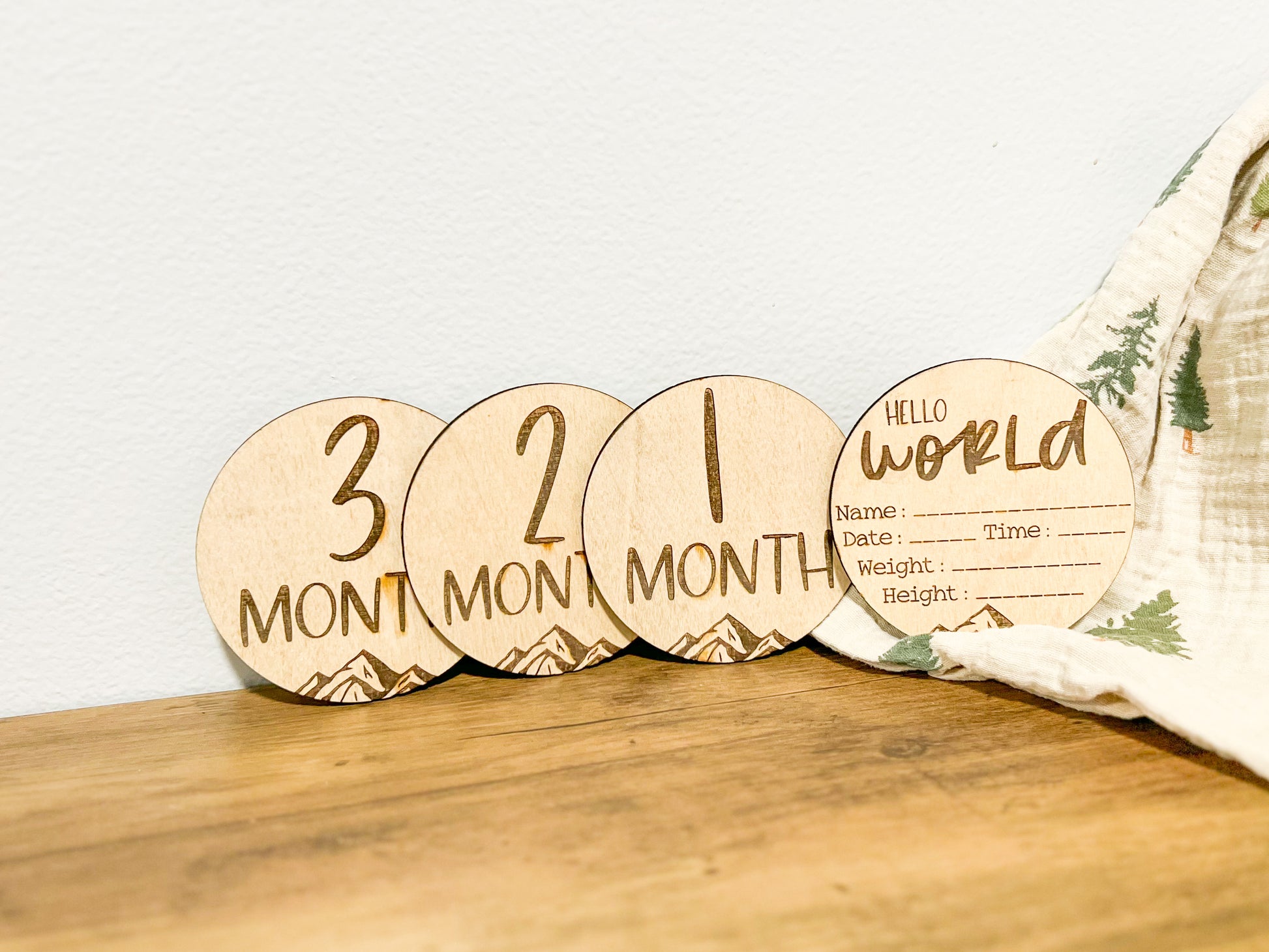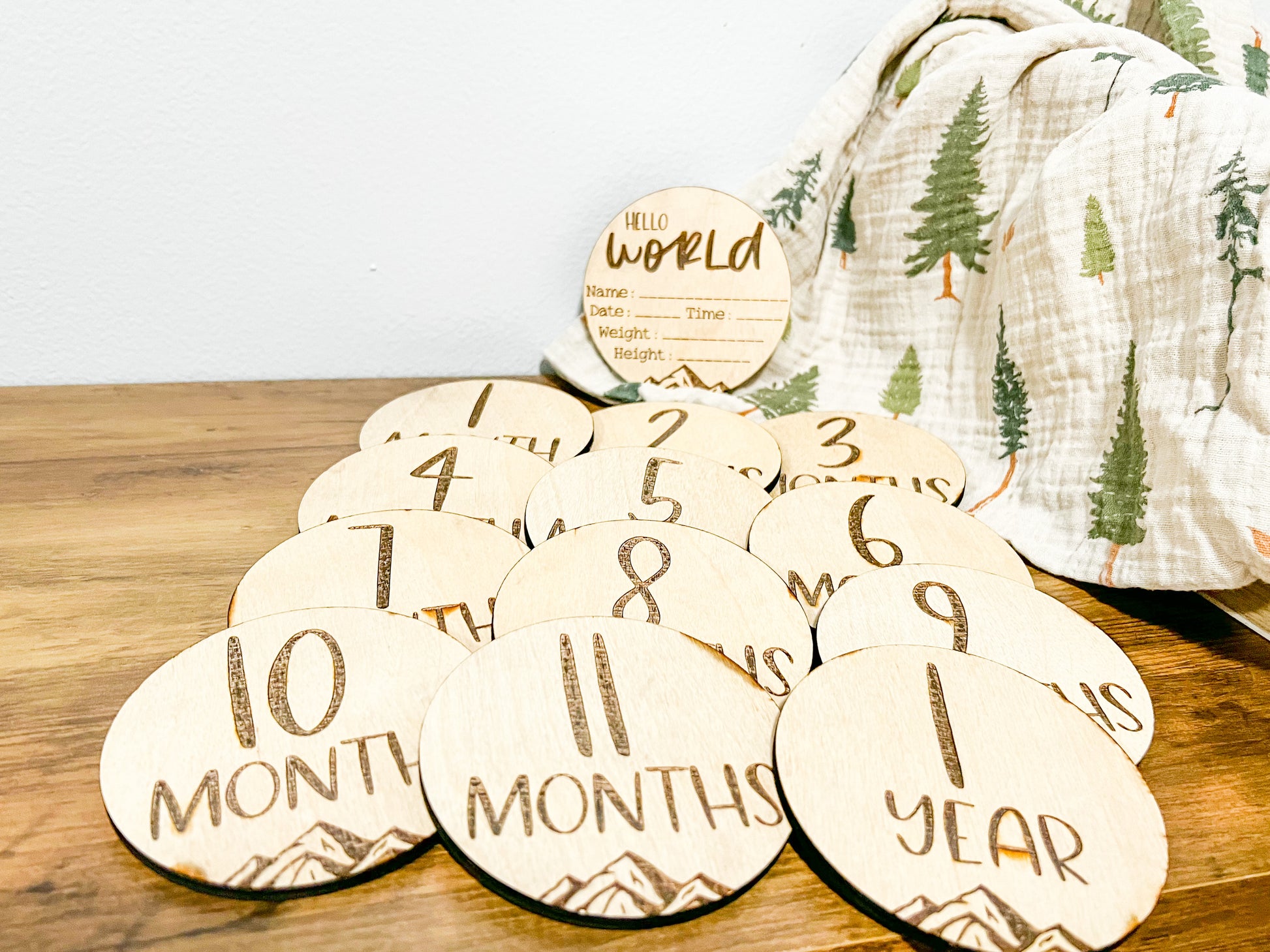 • 3.5” handcrafted wooden circles, darkly engraved to mark baby milestones and holidays, and has great contrast for photos