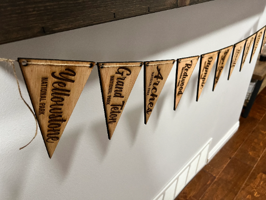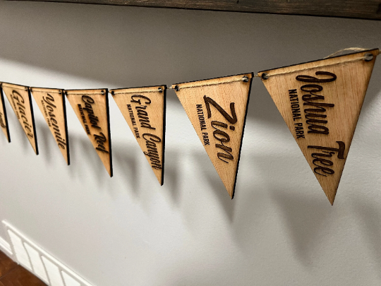 This beautiful, laser engraved pennant banner has 14 of the most iconic national parks in the US. This banner would make an excellent decoration for an event such as a National Park themed wedding reception, an outdoor/national park themed nursery, or any other outdoor themed event. The following 14 National Parks are included on this pennant banner: